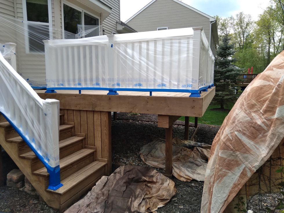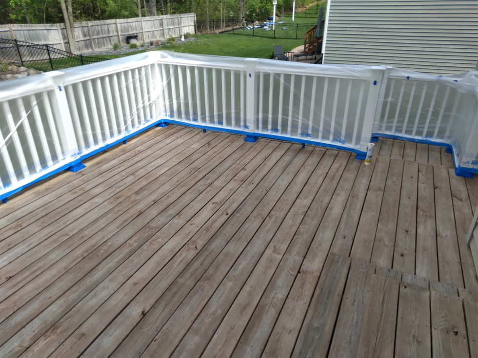 2nd Leve deck with vinyl railing requires a little more prep work. I couldn't find the, before work began images. They are not completely nessicary with this deck, the sanded and prepped images give you and idea to the upgrade in the end.